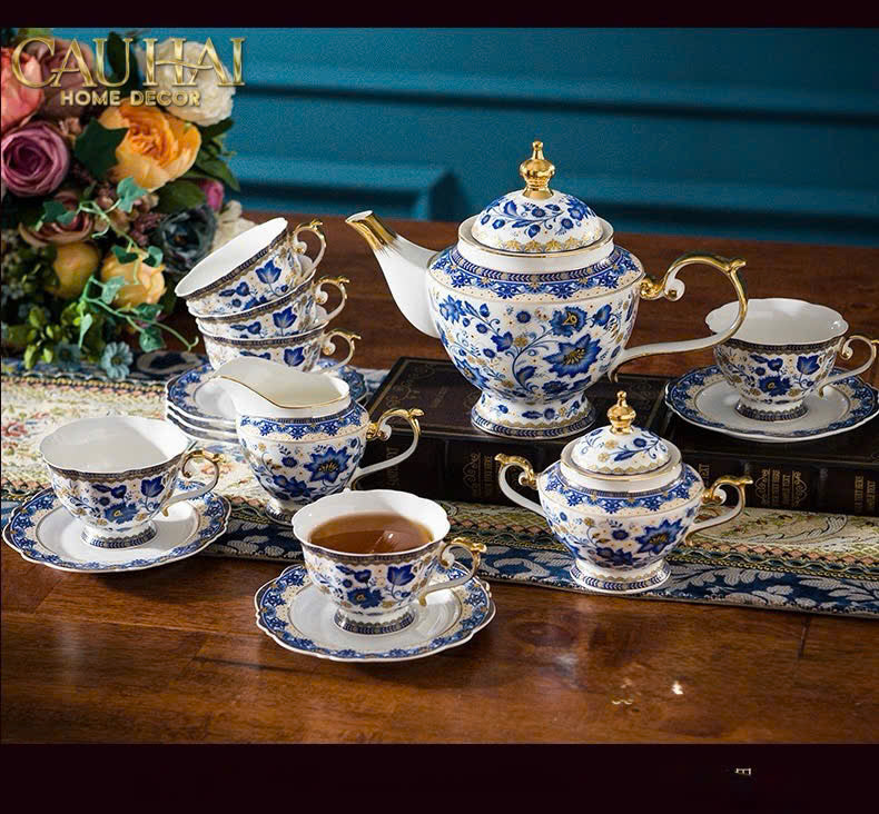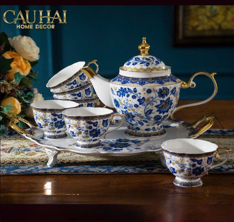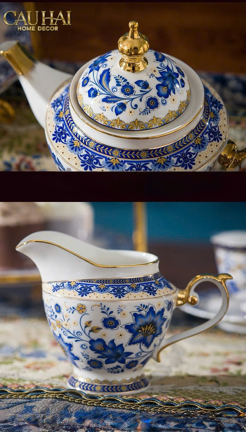 Màu xanh cobalt đặc trưng hòa quyện cùng điểm nhấn vàng gold tinh tế trên viền ấm và tách, tạo nên vẻ đẹp thanh lịch nhưng không kém phần sang trọng. Mỗi chi tiết được chăm chút tỉ mỉ, từ cánh hoa, lá cây đến thân cành – tất cả hòa quyện trong một bản giao hưởng thẩm mỹ hoàn hảo.