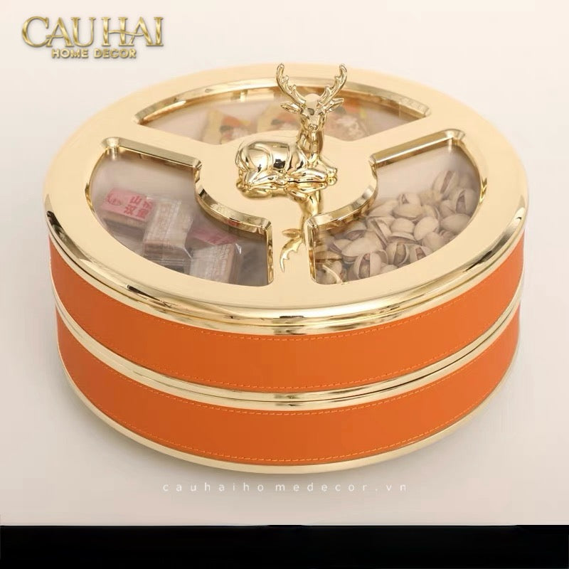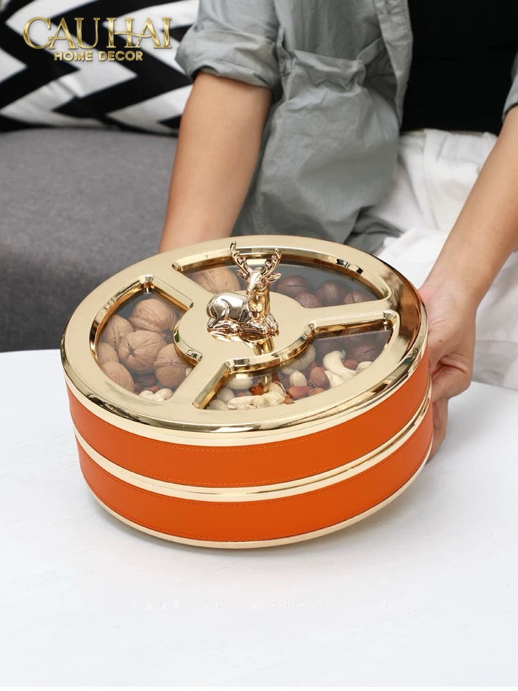 Chất liệu & Màu sắc: Vỏ ngoài bọc da Sienna cao cấp màu nâu đỏ ấm áp sang trọng, kết hợp với chi tiết viền vàng đồng tinh tế. Bên trong là các khay nhựa trong suốt chất lượng cao, giúp bảo quản và trưng bày bánh mứt một cách hoàn hảo. Thiết kế xoay 2 tầng với cơ chế mở đóng tiện lợi.