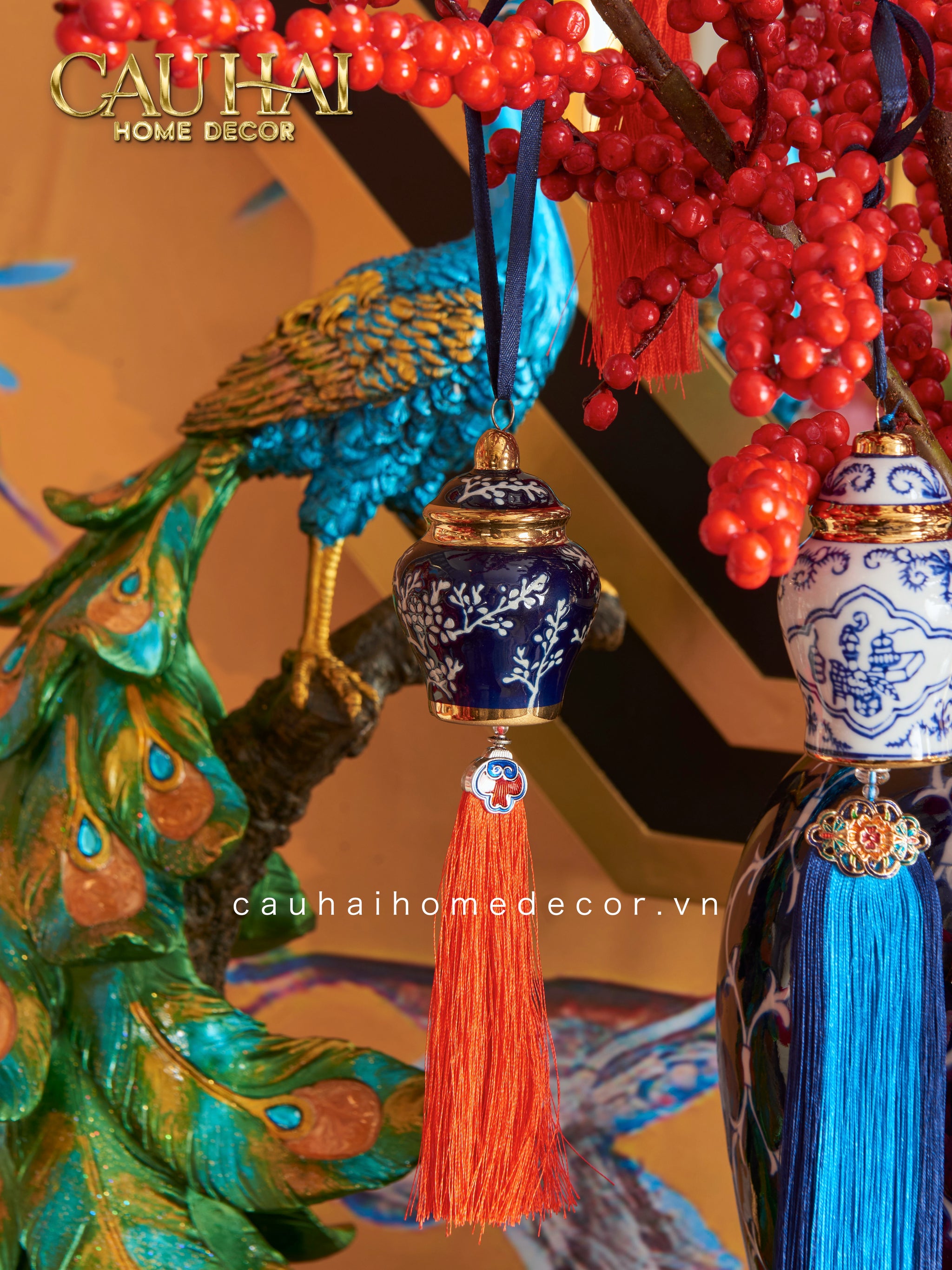 Chất liệu: Gốm sứ cao cấp với họa tiết xanh indigo truyền thống phong cách Đông Dương (Indochine). Dây treo bằng sợi vải hoặc dây trang trí bền đẹp. Họa tiết tinh xảo lấy cảm hứng từ nghệ thuật gốm sứ cổ điển Việt Nam và Pháp thuộc địa.