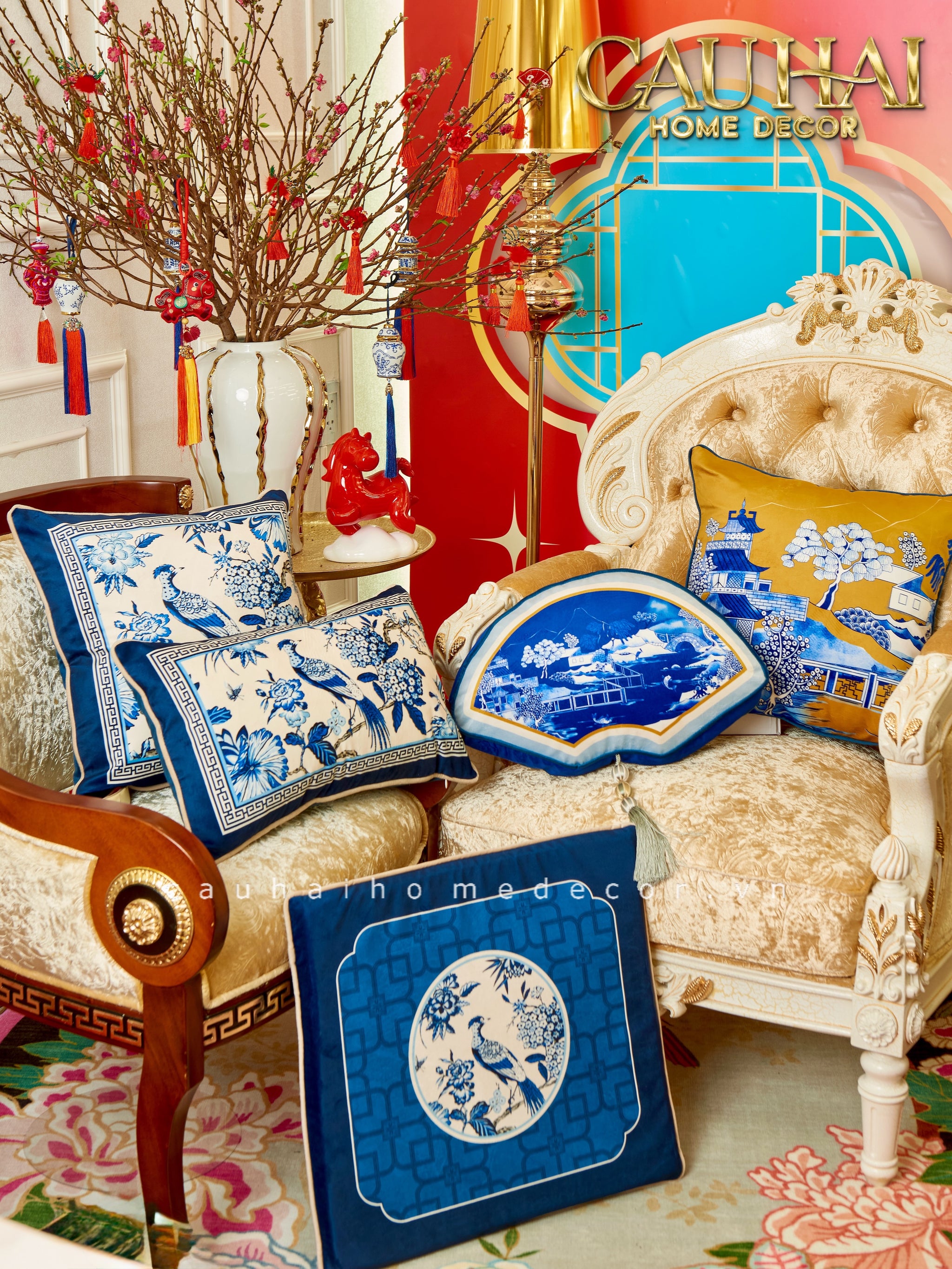 Tết Couture - Gối Nhung Quạt Indigo Emperor Fan Indochine Art Cushion