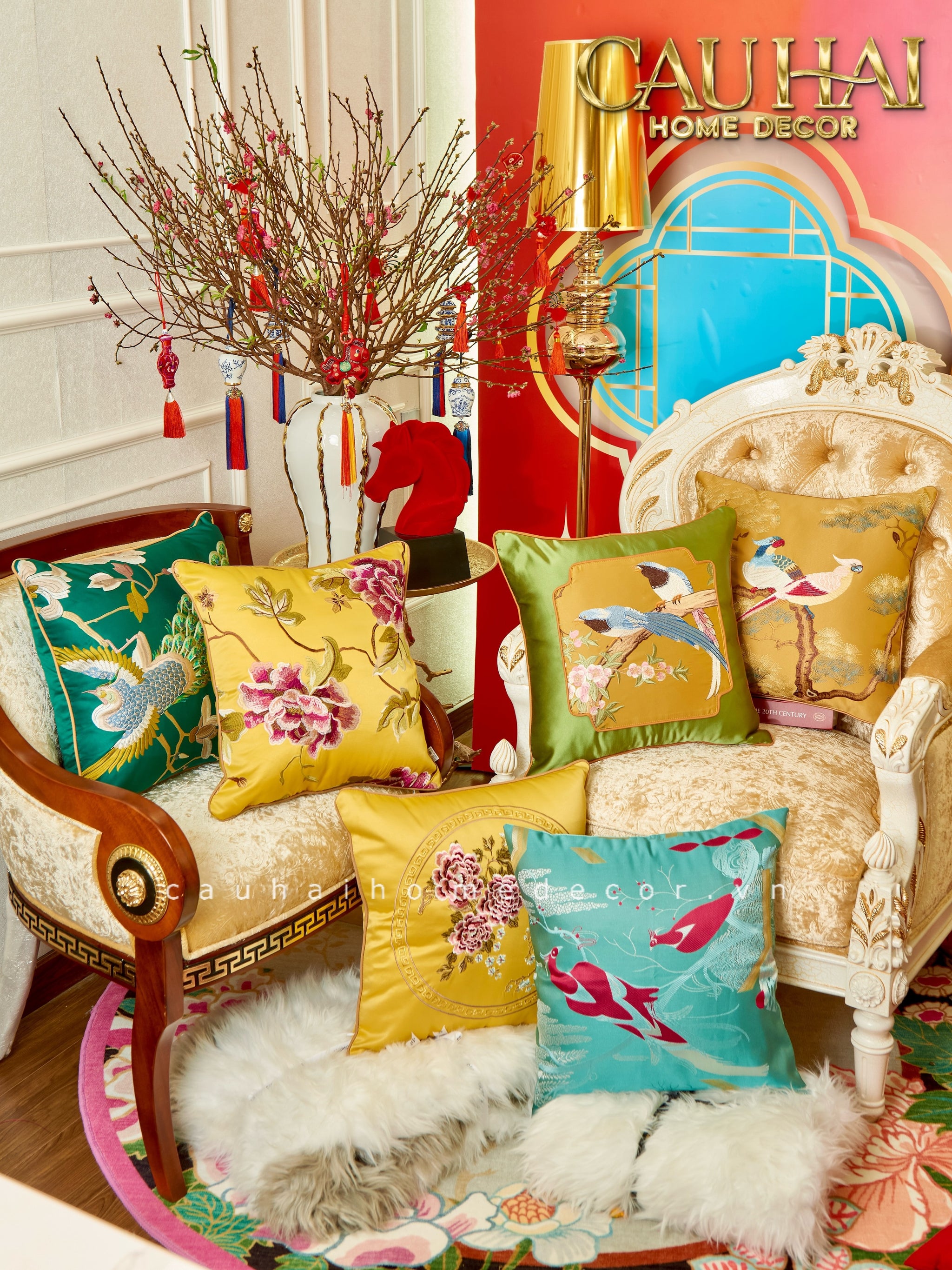 Tết Couture - Vỏ Gối Lụa Thêu Kim /Hỷ Song Thuỵ Nghinh Tân  45