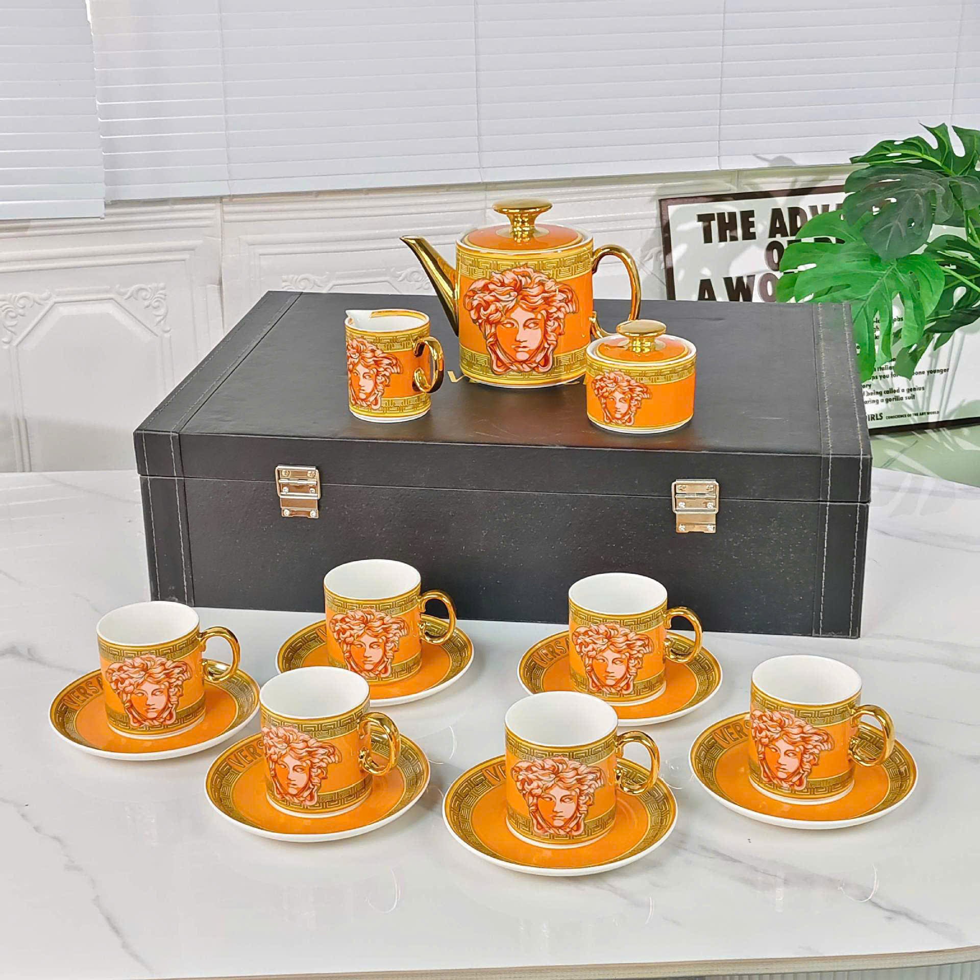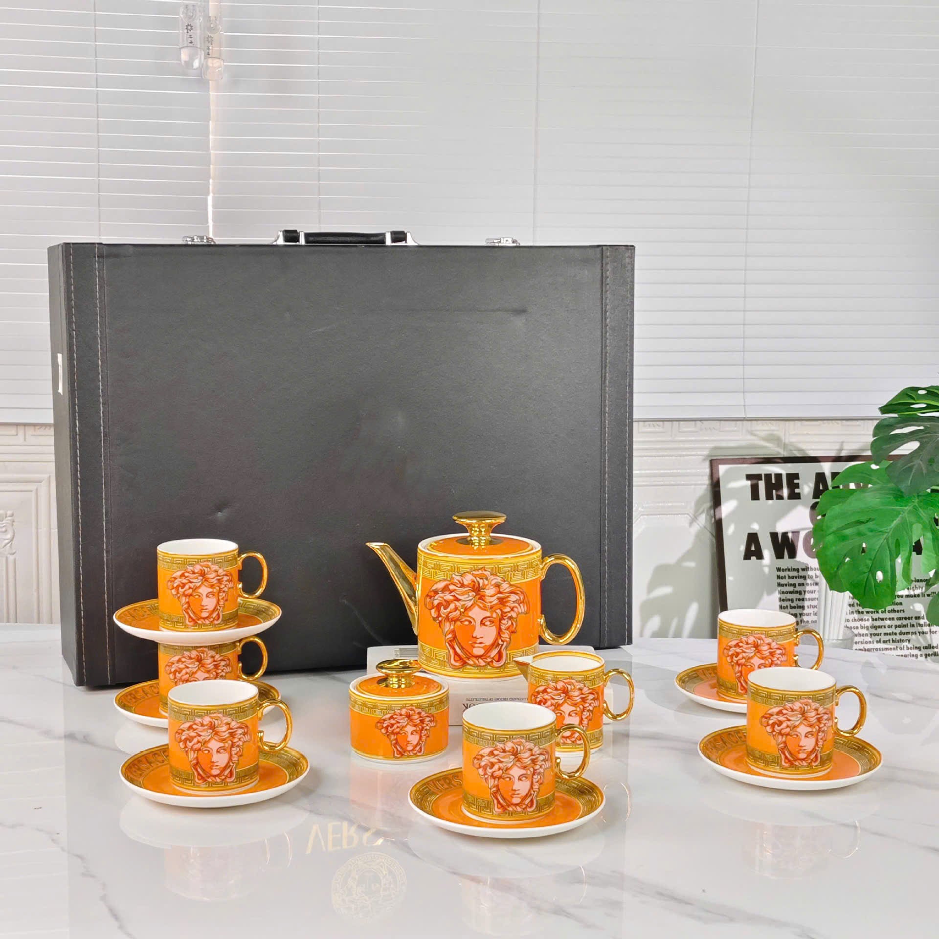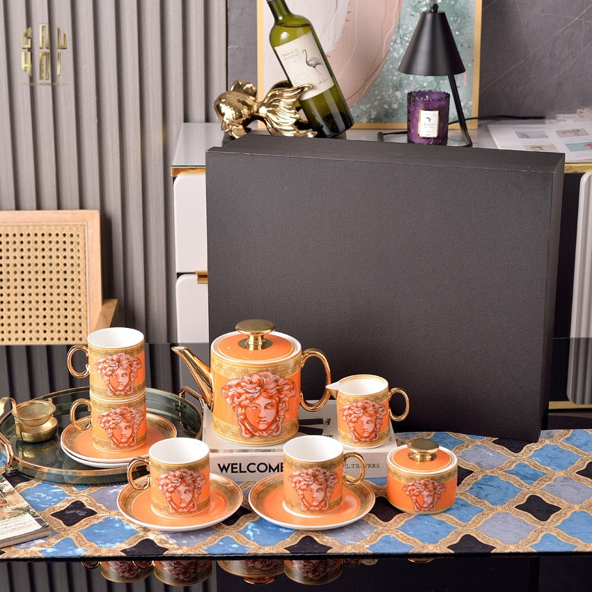 Mỗi chi tiết trên bộ trà đều được chế tác tỉ mỉ: từ họa tiết Medusa mạ vàng 24K nổi bật trên nền cam cháy, đến đường nét baroque cổ điển uốn lượn quanh thân ấm và viền tách. Đây không chỉ là bộ trà – mà là tuyên ngôn thẩm mỹ, là nghệ thuật bàn trà được nâng tầm thành trải nghiệm couture.