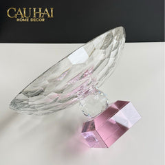 Sản phẩm hiện có hai phiên bản chân đế: vàng amber kim cương và hồng pastel tinh tế. Mặt đĩa đều là pha lê trong suốt cao cấp với họa tiết cắt mài tinh xảo, tạo nên vẻ đẹp đa dạng cho không gian.