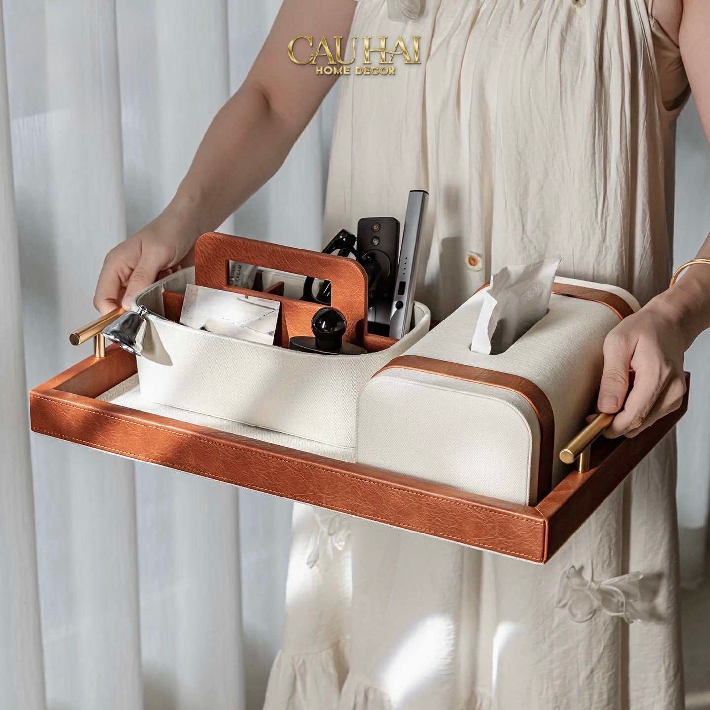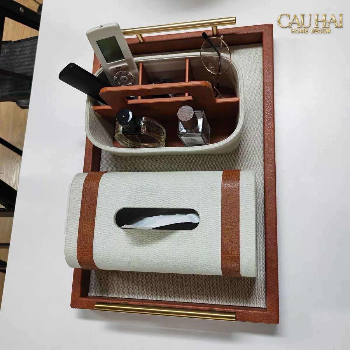 HOME COUTURE - SET KHAY HỘP GIẤY CANVAS LUX LEATHER HAVANA 3PCS