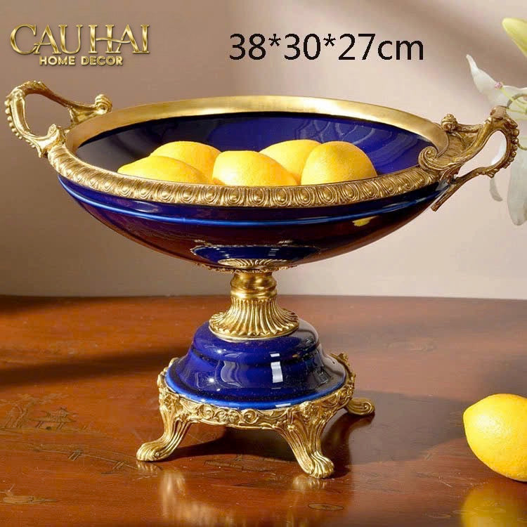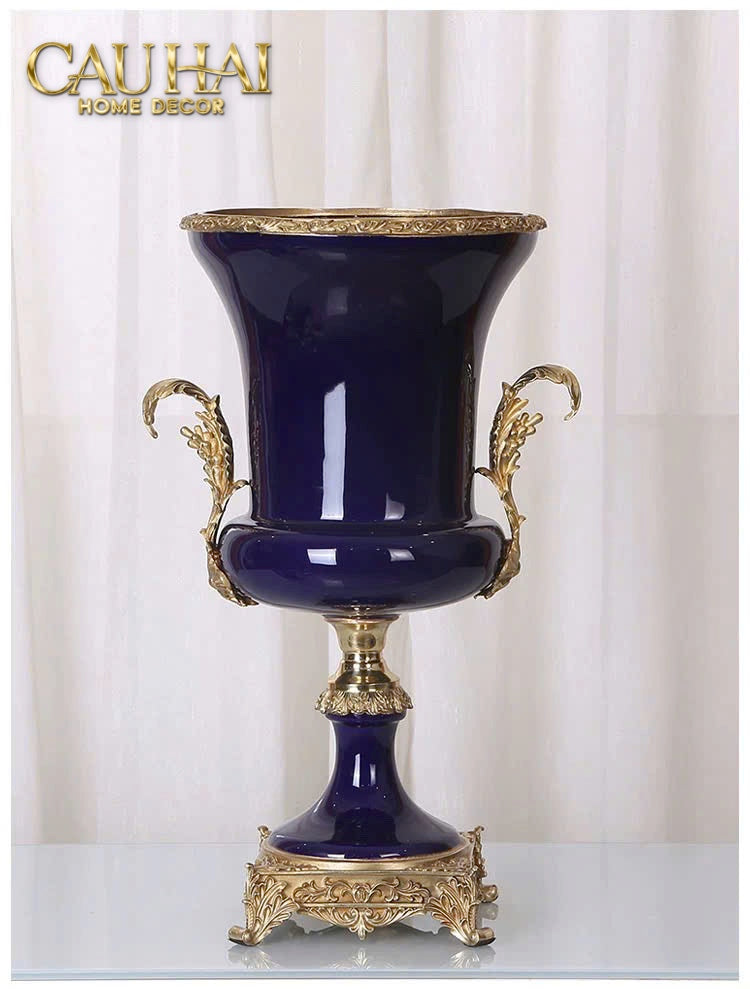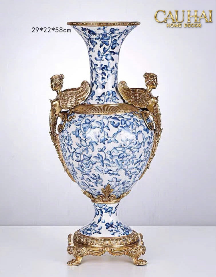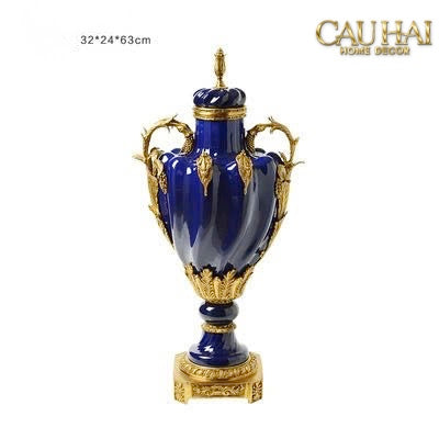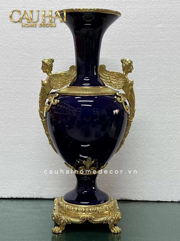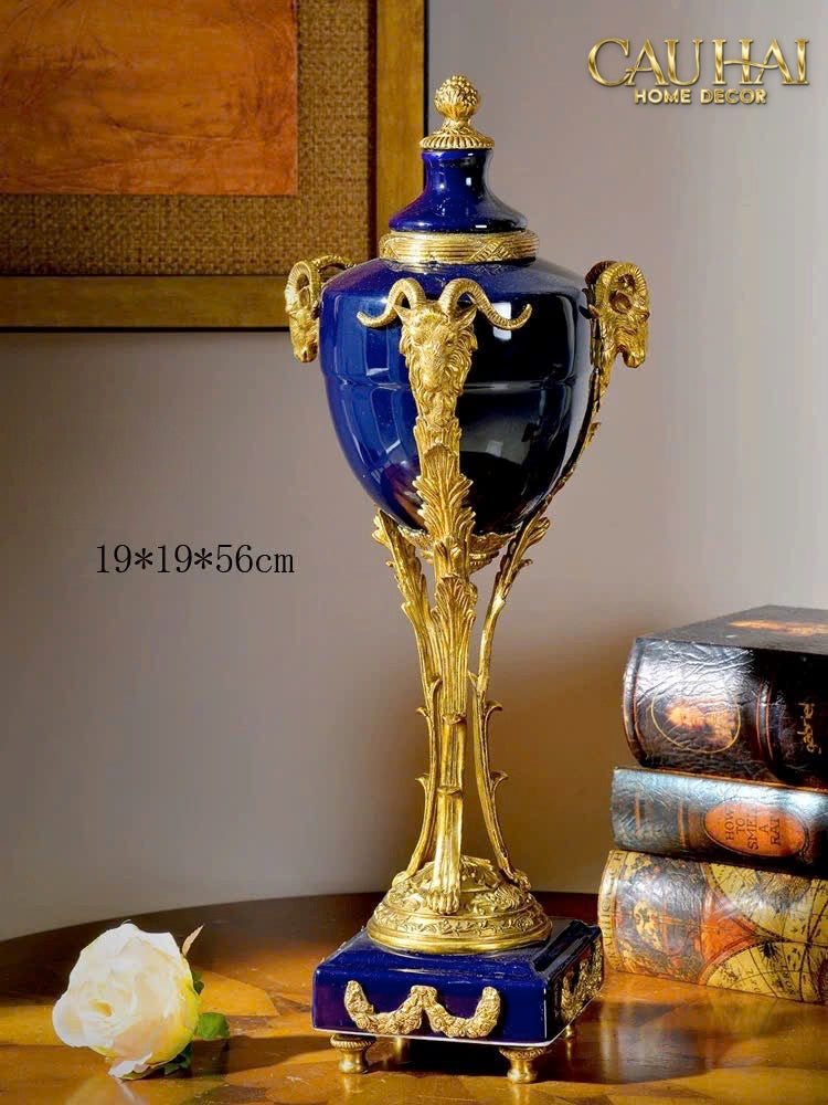 Chất liệu/Màu sắc: Sứ cao cấp hoặc Resin phủ men, thiết kế Column Urn (cột trụ cổ điển) kết hợp họa tiết Seraphim (thiên thần cấp cao) tinh xảo, màu Imperial Cobalt (xanh cobalt hoàng gia) sang trọng, quyền lực