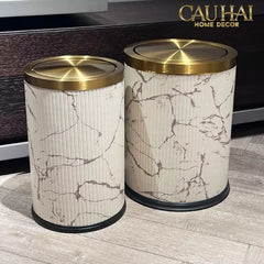 Chất liệu bề mặt: Da PU cao cấp vân đá marble, viền kim loại mạ vàng brass | Ứng dụng: Thùng rác mini bàn làm việc, phòng ngủ, phòng khách