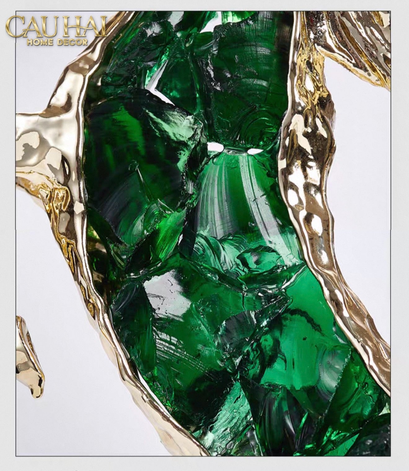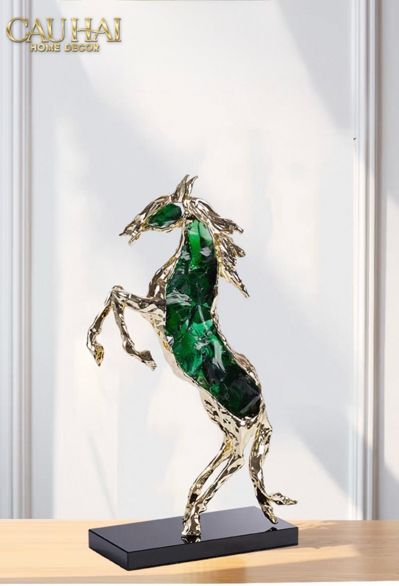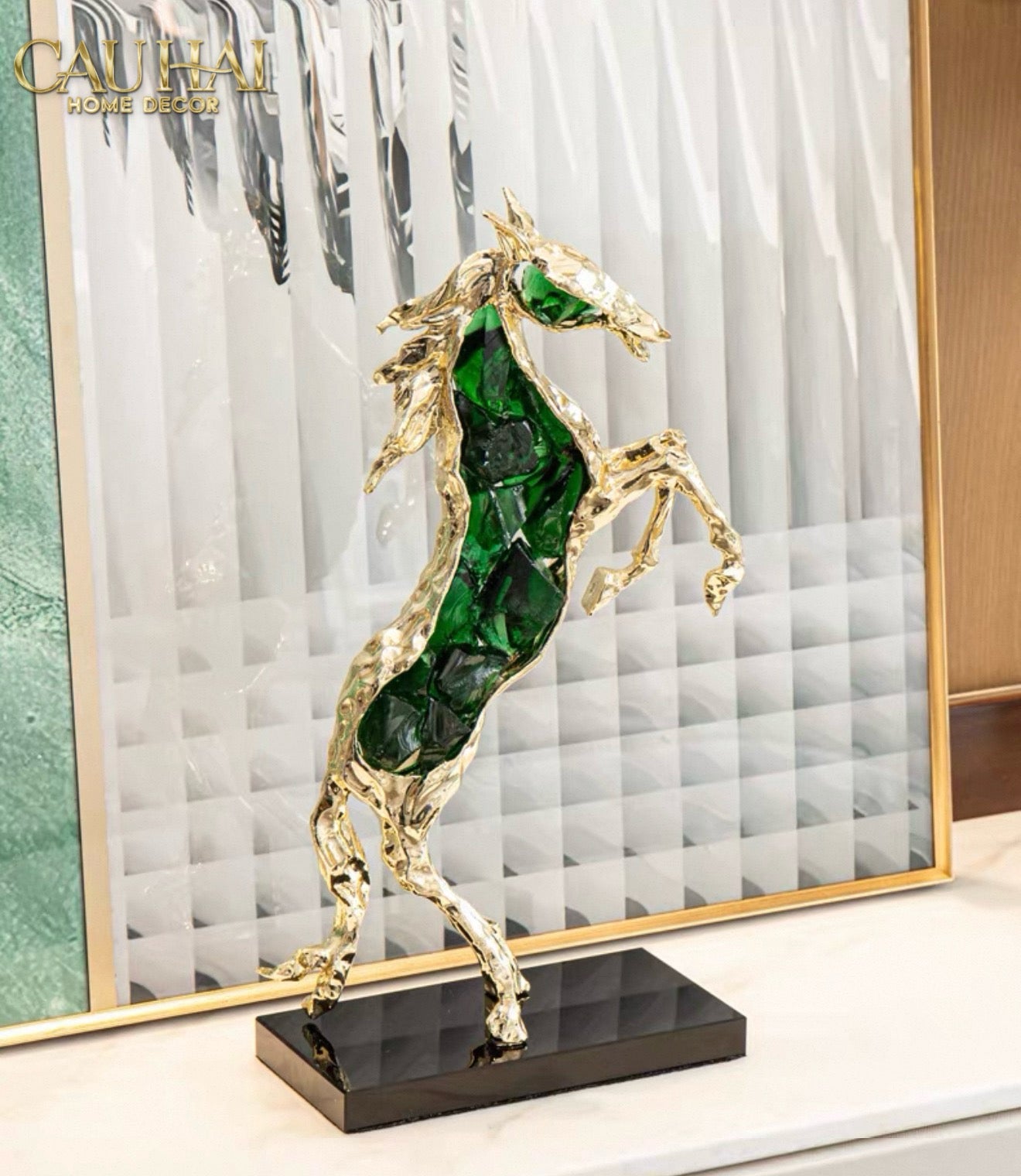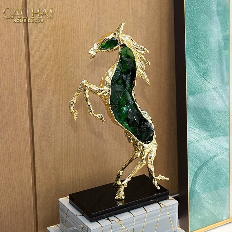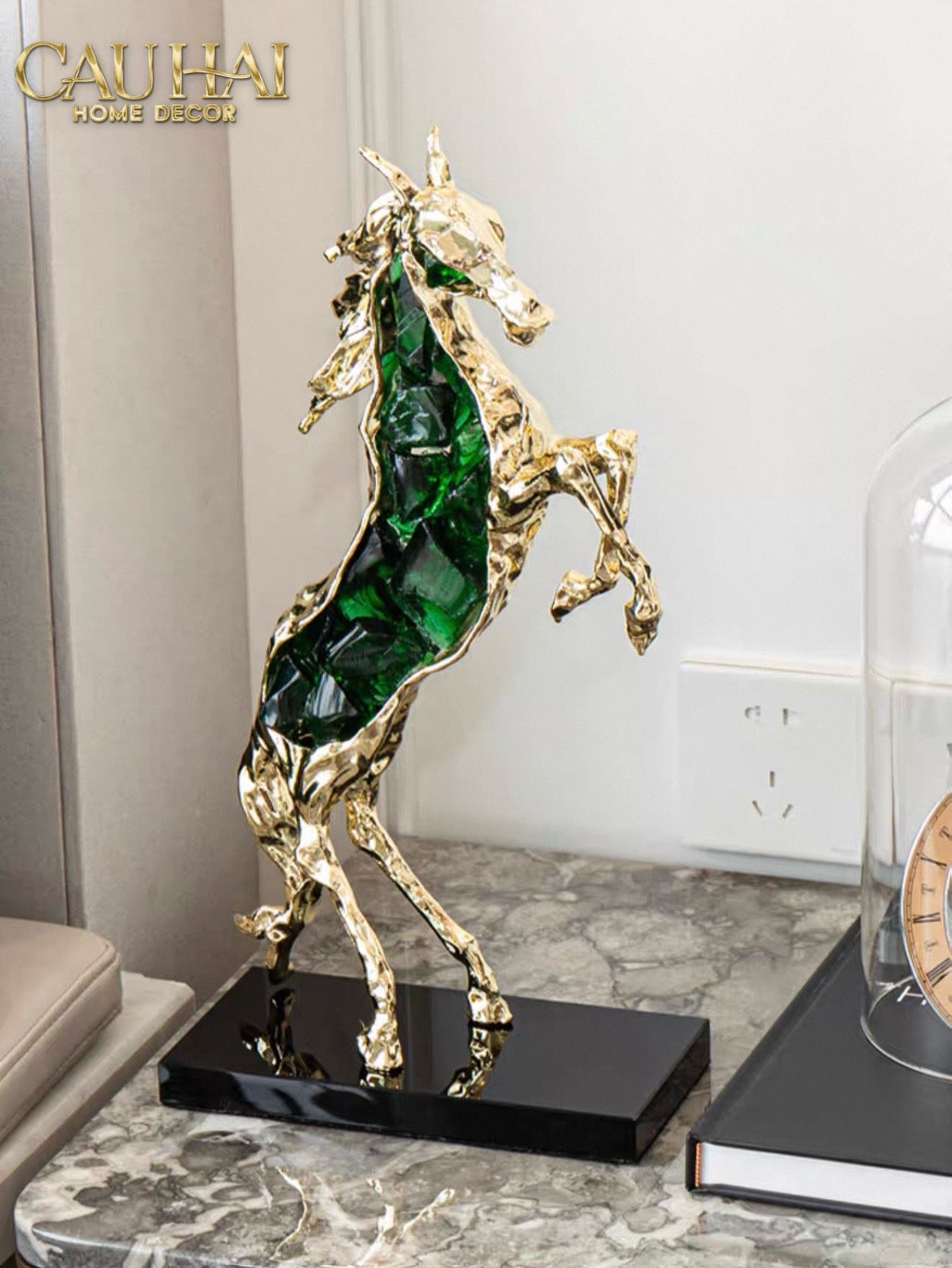 Mỗi chi tiết từ bờm ngựa, yên cương đến tư thế đều được chạm khắc tinh xảo bởi nghệ nhân lành nghề. Lớp mạ vàng 24K tạo nên ánh kim rực rỡ, kết hợp cùng sắc xanh lục bảo của đá Aventurine, mang đến vẻ đẹp quý phái và đầy năng lượng tích cực.