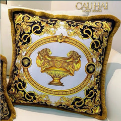 Thuộc dòng Maison Couture, chiếc vỏ gối này được chế tác trên nền vải Velvet cao cấp với bề mặt mềm mại, óng ánh. Trung tâm là hình ảnh bình hoa cổ điển La Coupe Des Dieux (Chiếc Chén Của Các Vị Thần) được in và thêu thủ công tinh xảo, tôn lên vẻ uy nghi và quyền lực. Xung quanh là khung viền baroque vàng gold với hoa văn cuộn lá đối xứng hoàn mỹ, tạo chiều sâu thị giác đầy mê hoặc.